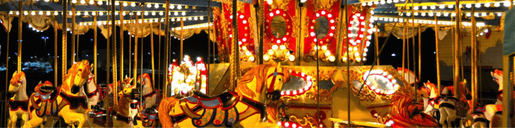 Painted horses move up and down going in rounds quite like the music. The carousel has a joyful aire about it. Fun lights and light-hearted tunes are joined by laughs and smiles. Your hand finds the reins of your favorite and you go around again.