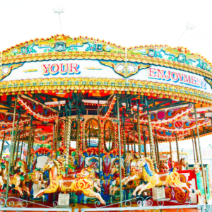 Painted horses move up and down going in rounds quite like the music. The carousel has a joyful aire about it. Fun lights and light-hearted tunes are joined by laughs and smiles. Your hand finds the reins of your favorite and you go around again.