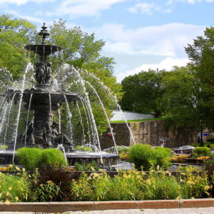 Catch yourself watching the water dance in the light. The arches of water are beautiful structures in the fountain. How many do you see? Can a coin be tossed under them, over them, or through them? The tinkling of water on water as it splashes and lands reaches your ears as you look on.